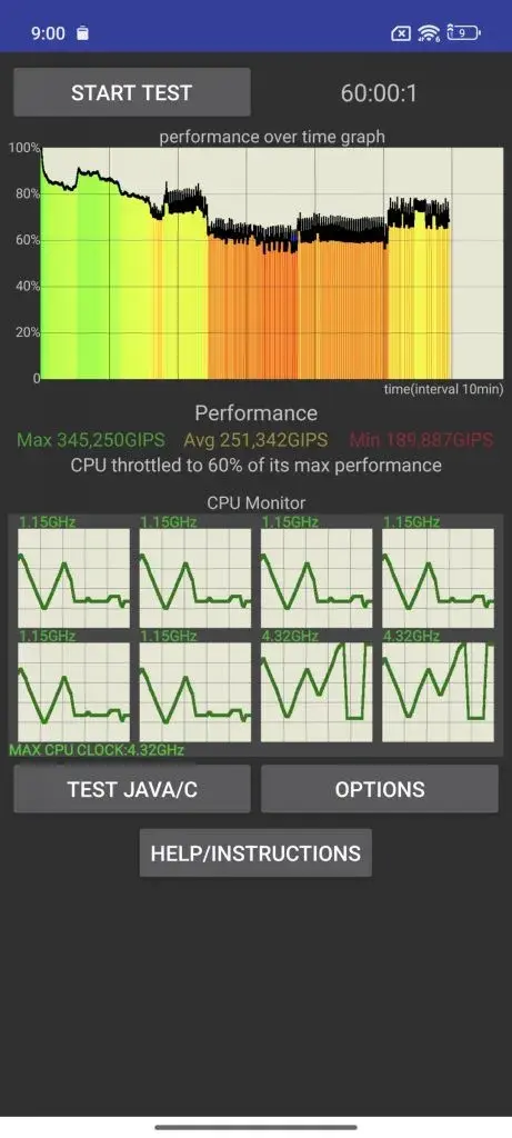 در آزمون پایداری پردازنده نیز عملکرد آن با افت به حدود ۶۰ درصد همراه بود که گرچه نگرانکننده نیست، اما نشان میدهد که در فشارهای مداوم و طولانیمدت، دستگاه با افت عملکرد و افزایش دما مواجه میشود. با این حال، دمای بدنه در استفاده روزمره یا بازیهای معمولی بهخوبی کنترل میشود و در حدی نیست که تجربهی کاربری را مختل کند.