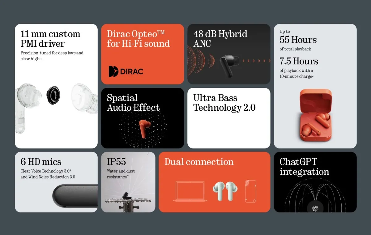 یکی از مهمترین ویژگیهای CMF Buds 2 بهرهمندی از درایورهای سفارشی ۱۱ میلیمتری است که به کمک فناوری Dirac Opteo و Nothing Ultra Bass 2.0 بهصورت حرفهای تنظیم شدهاند. این ترکیب باعث میشود تا کاربر تجربهای متفاوت از شنیدن صداهای بم و فرکانسهای پایین داشته باشد؛ بهطوریکه عمق صدا و وضوح جزئیات در سطحی قرار دارد که معمولا در ایربادهای میانرده کمتر دیده میشود. علاوه بر این، ناتینگ با استفاده از فناوری صدای فضایی یا همان Spatial Audio تلاش کرده تا تجربهی شنیداری کاربر را به سطحی فراگیر و سهبعدی ارتقا دهد، بهگونهای که صداها از اطراف به گوش برسند و نه فقط از داخل گوشها.