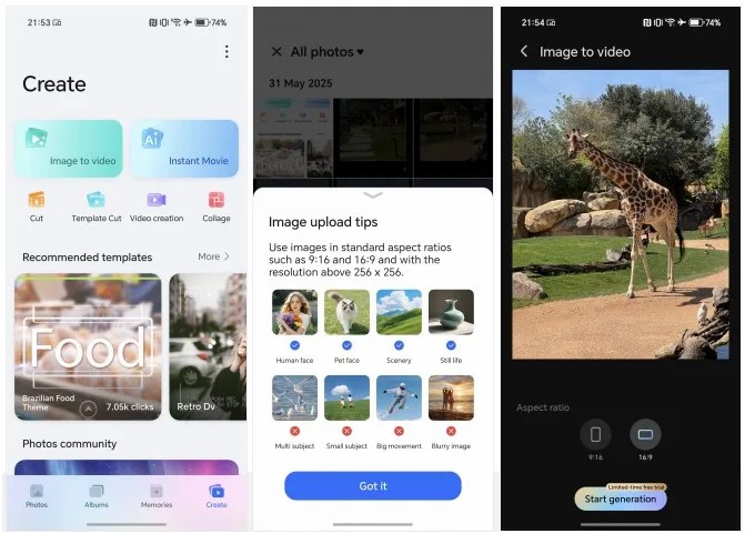 - Photo to Video (تبدیل عکس به ویدیو): تبدیل تصاویر ثابت به ویدیوهای 5 ثانیهای با کمک هوش مصنوعی Veo 2 گوگل؛ قابلیتی مبتنی بر توکن.